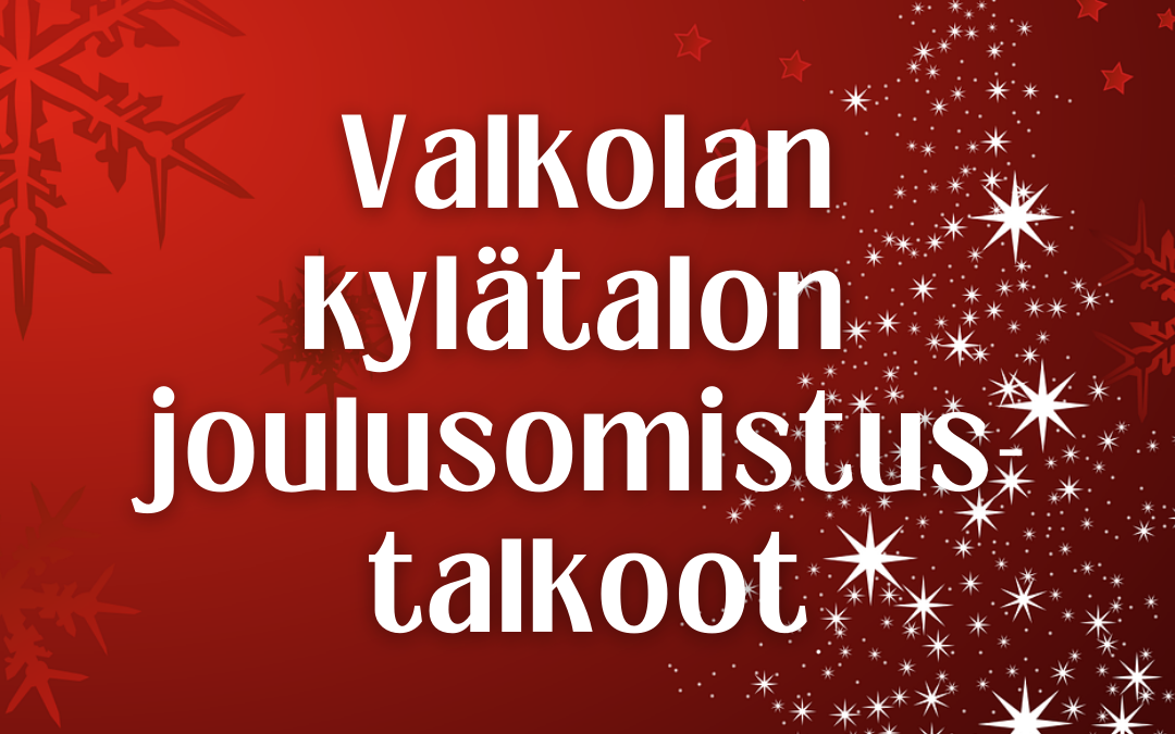 Valmistellaan yhdessä Valkolan kylätalo jouluun ti 16.12. klo 17-19! Askarrellaan kierrätysmateriaalista iloa, valoa ja tuikkivia tähtiä kylätalon ikkunoihin kyläläisiä ilahduttamaan. Saat kivoja idoita ja ehkäpä voit loihtia samalla joulutunnelmaa myös omaan ikkunaasi. Joulupajassa on tarjolla myös pientä purtavaa. Lämpimästi tervetuloa rakentamaan kestävää joulun tunnelmaa yhdessä!